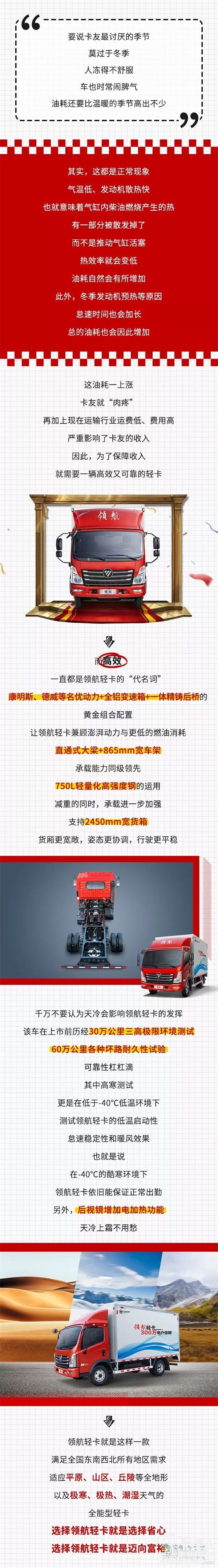 領航輕卡,滿足全國東南西北所有地區需求,適應平原、山丘、丘陵等全地形以及極寒、極熱、潮濕天氣的全...
