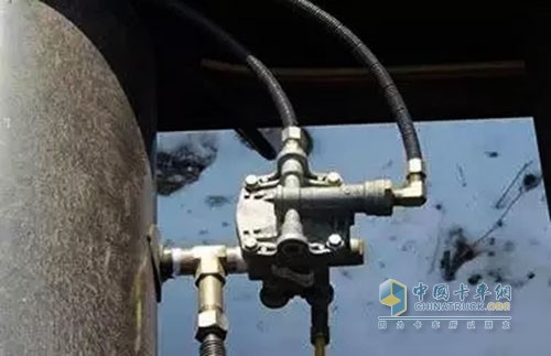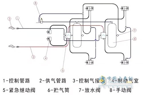 目前國內生產的半掛車采用的是雙管路設計的,圖中①藍色線為控制管路,②紅色線為供氣管路,通過③控制氣接頭連接到牽引車。