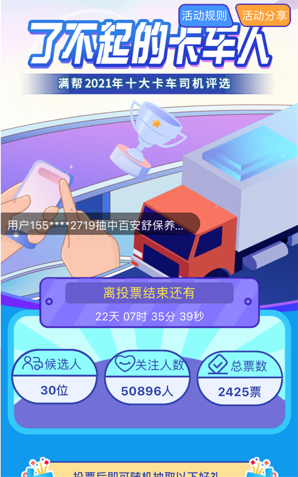 2021年9月22日,數字貨運平臺滿幫集團發起的“了不起的卡車人—2021年十大卡車司機評選”活動前三十強出爐,活動進入十大卡車司機票選環節。