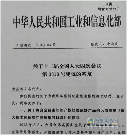 答復(fù)中明確指出:將與有關(guān)部門(mén)密切溝通,爭(zhēng)取將具有自主知識(shí)產(chǎn)權(quán)的緩速器產(chǎn)品列入商用車(chē)《重大技術(shù)裝備推廣應(yīng)用指導(dǎo)目錄》;也會(huì)繼續(xù)組織對(duì)相關(guān)技術(shù)標(biāo)準(zhǔn)和管理要求的修訂完善,擴(kuò)大緩速器的安裝范圍,加強(qiáng)實(shí)際安裝情況的監(jiān)管,并積極研究通過(guò)國(guó)家已有的渠道和項(xiàng)目等方式,加大對(duì)緩速器企業(yè)和產(chǎn)品的支持力度。