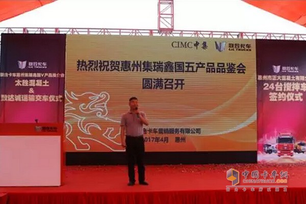 2017年4月7日,聯(lián)合卡車(chē)攜手惠州集瑞鑫在惠州舉辦了聯(lián)合卡車(chē)國(guó)V產(chǎn)品品鑒會(huì)暨聯(lián)合通G7產(chǎn)品授牌儀式,同時(shí)還在活動(dòng)現(xiàn)場(chǎng)與致達(dá)誠(chéng)運(yùn)輸公司完成了25臺(tái)聯(lián)合卡車(chē)產(chǎn)品交車(chē)儀式。