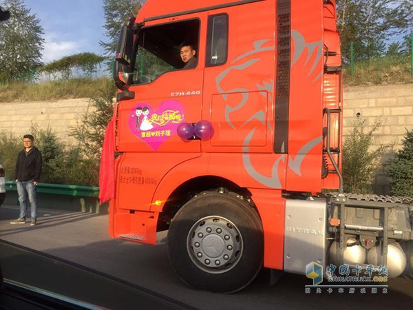 結婚當天,4輛“高大威猛”的汕德卡一字排開。卡車車頭、車身、車頂都裝飾上了鮮花和貼畫,遠遠望去氣勢十足,這車開在馬路上當真是比跑車更有氣勢更炫酷。