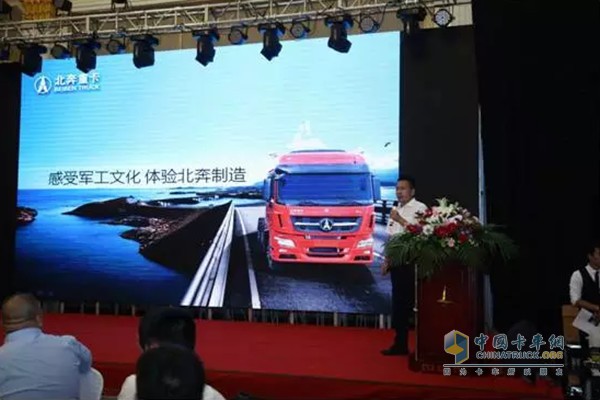 北奔重汽營(yíng)銷公司副總經(jīng)理尹柏松上臺(tái)介紹北奔?xì)v史