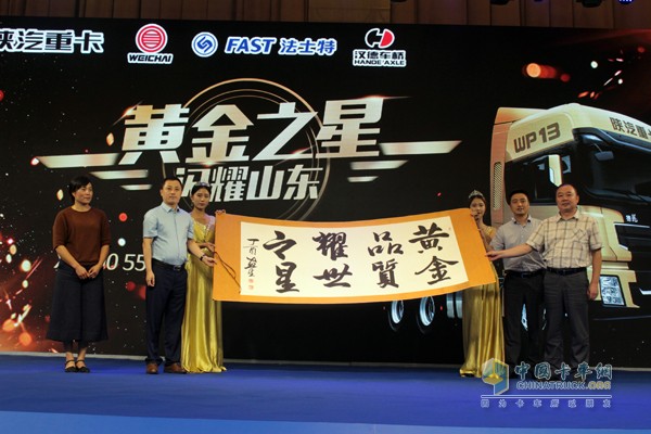 在臨沂站團(tuán)購會上,田兆梅女士代表平邑鑫蘭物流公司贈送陜汽重卡一幅“黃金品質(zhì)耀世之星”的墨寶。原來田女士在選擇車輛時,都會自己實(shí)地跟車體驗(yàn)一周以上,做出真實(shí)對比,而這八個大字可以說很好的詮釋了陜汽德龍X3000 550馬力黃金之星的內(nèi)涵。