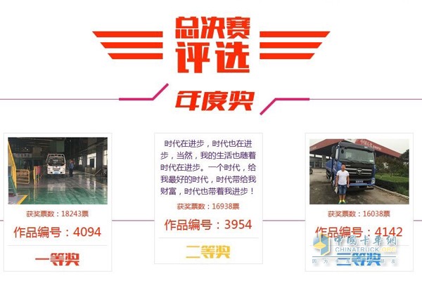 伴隨著11月份冠亞季軍的最終結果出爐,陪伴大家半年之久的出彩卡車人也落下帷幕。最終,參賽用戶宋海清、劉梟、王天鵬分別以18243票、16938票、16038票獲得年度冠亞季軍,他們還將獲得由福田時代送出的價值5000元尊享游、1500元的加油卡1張和時代或瑞沃仿真車模。