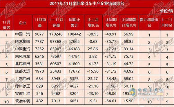 2017年11月半掛牽引車生產銷量排名