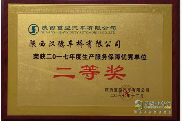 漢德車橋榮獲陜汽重卡“2017年度生產(chǎn)服務(wù)保障優(yōu)秀單位二等