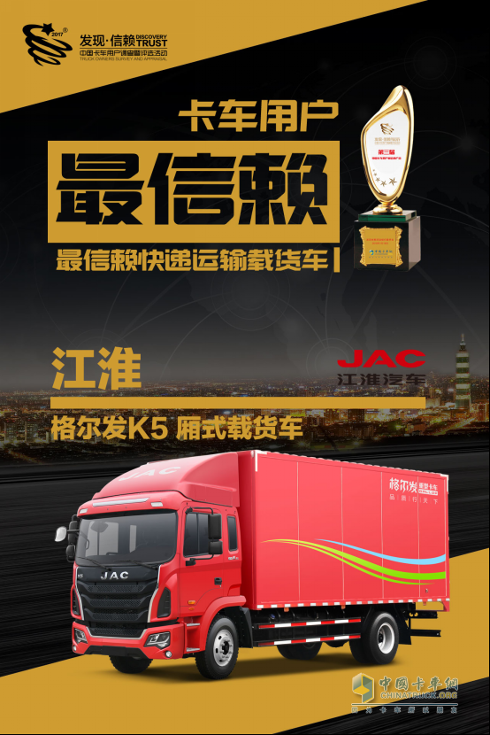 2018年1月18日,由中國卡車網舉辦的“發現信賴—中國卡車用戶調查暨評選活動”在北京圓滿落下帷幕。江淮格爾發K5快遞載貨車獲得“2018年度中國卡車用戶最信賴載貨車”大獎。