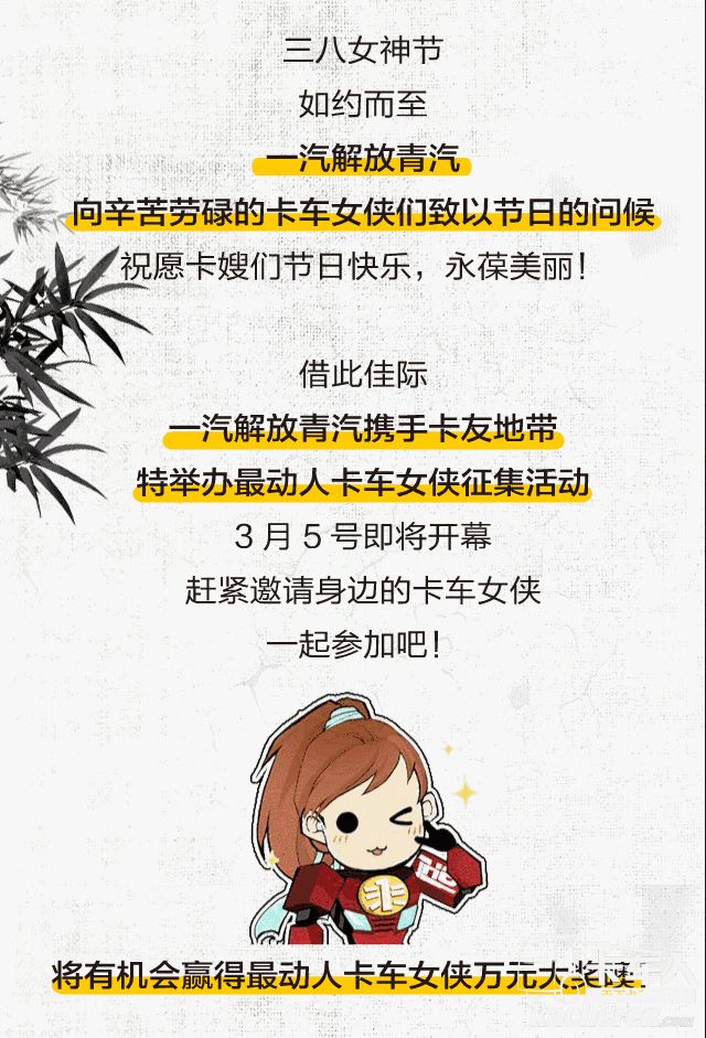 三八女神節將至,在這個特別的時間,一汽解放青汽推出了特別企劃,尋找中國最動人卡車女俠,用實際行動為卡車女俠們送上祝福,參與活動更有機會贏萬元大獎哦!
