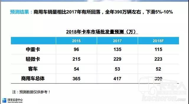 在近期舉辦的2018年中國商用車后市場年度大會上,國家信息中心信息資源開發部商用車研究室處長謝國平針對2018年中國商用車市場發展趨勢進行了主題演講。謝國平分析預測到,“2018年,商用車銷量相比2017年有所回落,全年390萬輛左右,下滑5%-10%,其中,中重卡銷量或在115萬輛左右。”