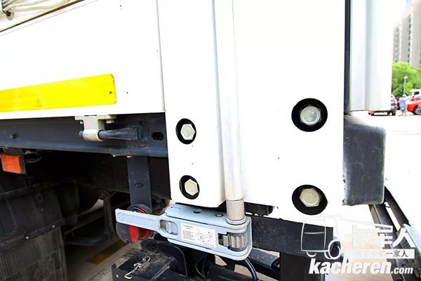 液壓尾板則是著名的B.A.R牌仔細觀察可以發現,在車尾還安裝了喇叭口牽引鉤,這也是為了牽引全掛車而做的準備。