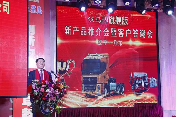 在會上,遼寧丹東昌順汽車貿(mào)易有限公司董事長于奎致歡迎詞表示,丹東昌順汽貿(mào)加盟華菱星馬一年多以來,在丹東昌順公司全體員工的共同努力下,在社會各界和各大物流公司的大力支持幫助下,憑借華菱星馬漢馬H7/H9系列產(chǎn)品省油、可靠、安全、舒適的優(yōu)秀品質(zhì),才使我們發(fā)展壯大,有了再攀高峰的生機與活力。今天,為了答謝在座的各位嘉賓朋友長期以來的信賴和支持,我們特意舉辦漢馬H9旗艦版新產(chǎn)品推介會暨客戶答謝會,邀請大家歡聚一堂,既是要讓大家了解漢馬H9旗艦版新產(chǎn)品的特點和優(yōu)勢,也是要讓大家進一步感受到我們服務(wù)廣大客戶、感恩廣大朋友的誠心與誠意。