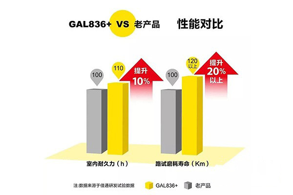 為了提高產品使用壽命,降低輪胎使用成本,佳通通過運用多種創新設計和配方技術將GAL836+產品的耐磨性全新升級。比如,采用低生熱高耐磨橡膠和納米級高補強炭黑等全新升級的高耐磨配方,使胎面耐磨性能大幅提升;運用德國進口嚙合型密煉機和創新混煉技術橡膠與炭黑結合更充分、分散度更好,產品品質更加穩定;通過對輪廓的優化設計,使得肩部結構更加穩定、并可有效減少肩部變形生熱。根據研發試驗數據現實,與普通輪胎相比,升級后的GAL836+的室內耐久力提升了10%以上,路試磨耗壽命提高了20%以上。