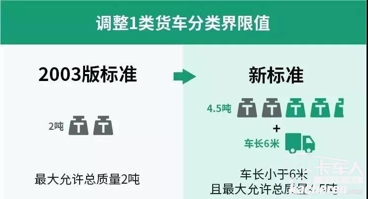 新的車型劃分標準中,將1類和2類貨車分類界限值,確定為車長小于6米且允許總質量4.5噸。