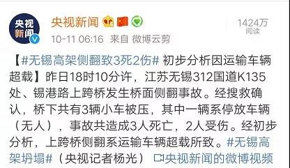 新聞報(bào)道中表示,經(jīng)初步分析,上跨橋側(cè)翻系運(yùn)輸車輛超載所致。