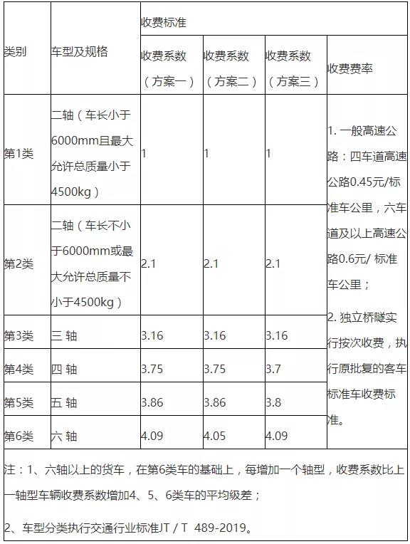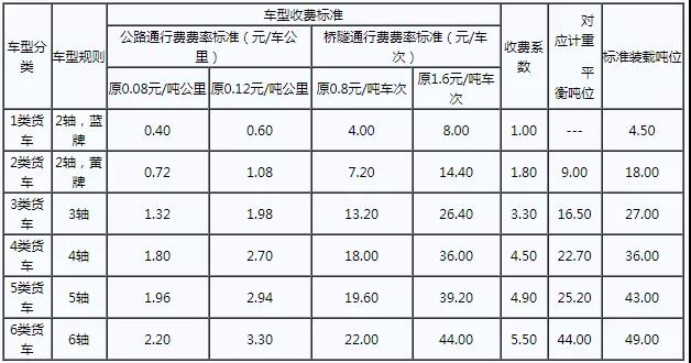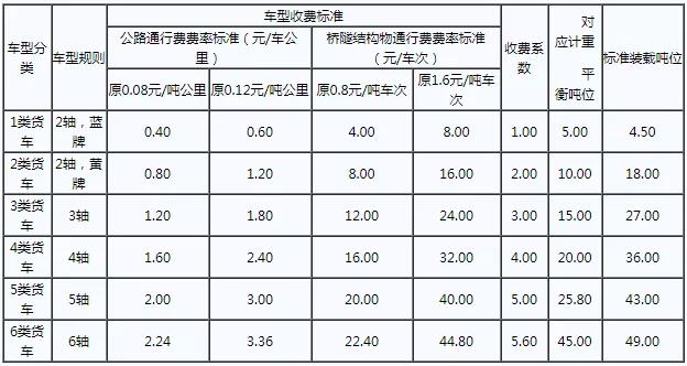 貨車由計(jì)重收費(fèi)改為按車型(軸數(shù))收費(fèi)后,按照軸數(shù)分為6類車型,每一車型單公里收費(fèi)標(biāo)準(zhǔn)由收費(fèi)費(fèi)率與該車型對(duì)應(yīng)的收費(fèi)系數(shù)相乘計(jì)算。