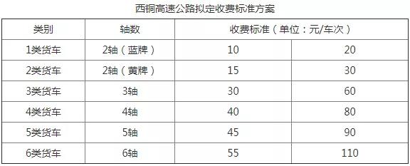 西銅高速公路按車次收費(fèi),擬定收費(fèi)標(biāo)準(zhǔn)方案見下表。