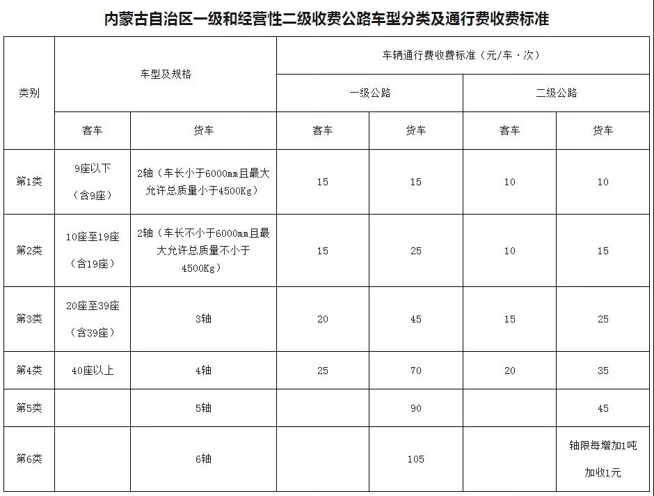 高速公路車型分類及車輛通行費(fèi)收費(fèi)標(biāo)準(zhǔn)按照《內(nèi)蒙古自治區(qū)高速公路車型分類及通行費(fèi)收費(fèi)標(biāo)準(zhǔn)》執(zhí)行。具體內(nèi)容可參照下表: