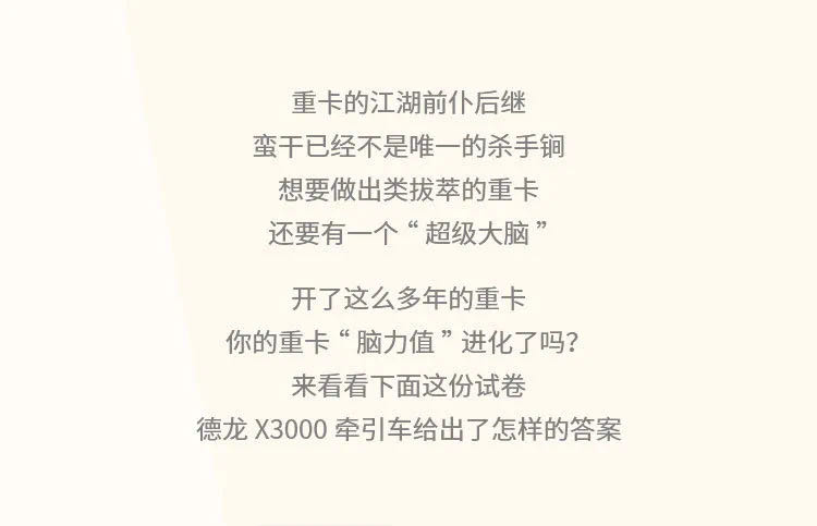 重卡的江湖前仆后繼,蠻干已經不是唯一的殺手锏,想要做出出類拔萃的重卡,還要有一個“超強大腦”。開了這么多年的重卡,你的重卡“腦力值”進化了嗎?來看看下面這份試卷,德龍X3000牽引車給出了怎樣的答案。