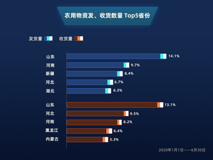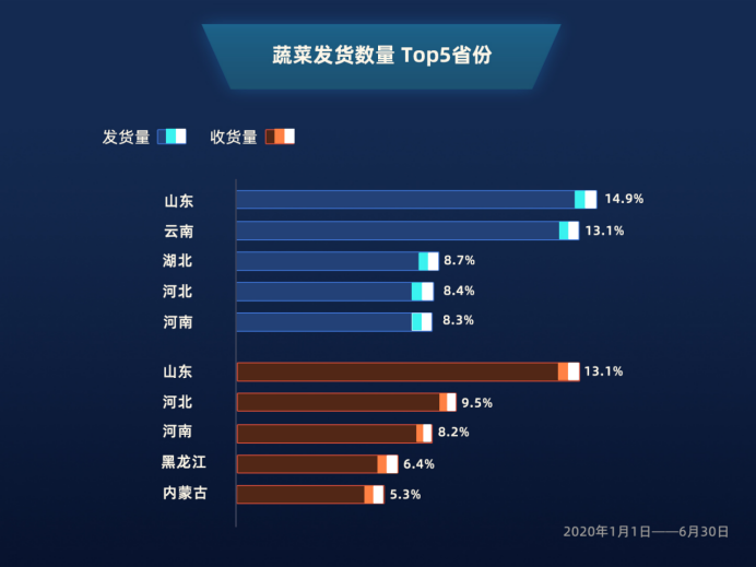 值得一提的是,年初疫情最為嚴(yán)峻的湖北省,在恢復(fù)生產(chǎn)后,依然躋身農(nóng)用物資發(fā)貨數(shù)量top5,同時(shí)在貨運(yùn)平臺(tái)上蔬菜的發(fā)貨數(shù)量中,以8.7%的占比位居第三。充分說(shuō)明,遭遇疫情沖擊的湖北,已迅速恢復(fù),在保障本省農(nóng)業(yè)產(chǎn)品需求的同時(shí),也具備向外省輸送到能力。