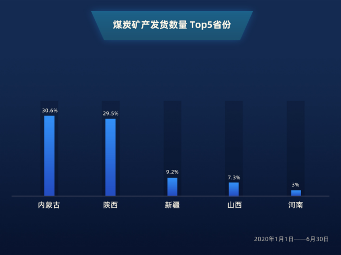 作為保障能源供應(yīng)的重點(diǎn)貨物,煤炭礦產(chǎn)也是公路貨運(yùn)中非常重要的品類。上半年,受疫情影響,部分地方政府對(duì)人員、車輛流動(dòng)進(jìn)行了不同程度的調(diào)控,導(dǎo)致煤炭公路運(yùn)輸受到影響。滿幫貨運(yùn)平臺(tái)數(shù)據(jù)顯示,1至6月,煤炭礦產(chǎn)類發(fā)貨量與去年同期相比下降7.6%。從煤炭礦產(chǎn)的發(fā)貨數(shù)量來(lái)看,產(chǎn)業(yè)依然在資源富集地區(qū)集中,山西、內(nèi)蒙古、陜西和新疆,這四個(gè)省份原煤產(chǎn)量占全國(guó)76.8%,發(fā)貨數(shù)量也穩(wěn)居前四,持續(xù)將優(yōu)質(zhì)產(chǎn)能向全國(guó)釋放。