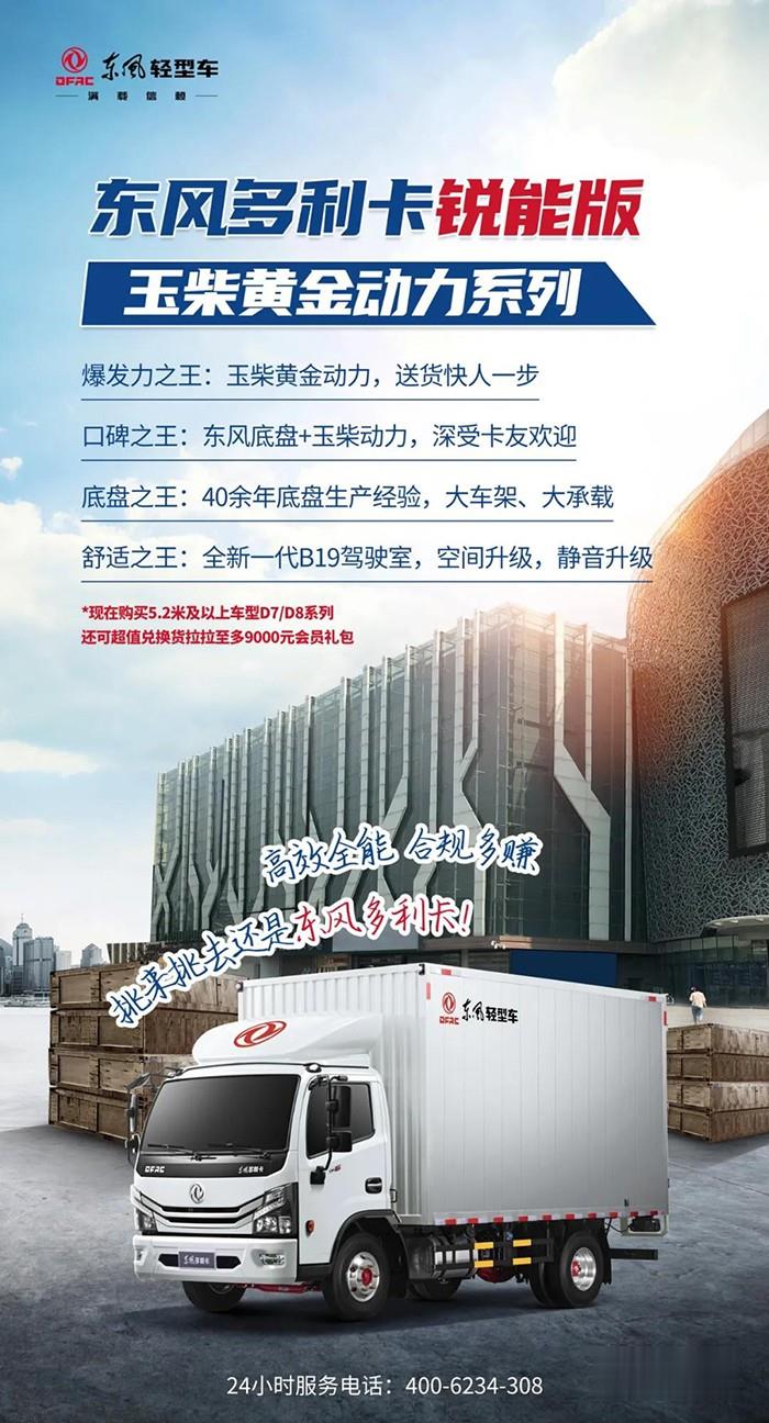東風多利卡銳能版玉柴黃金動力系列,采用新技術、新材料、新科技,實現整車輕量化,公告整備質量3.2T,不超重且能承載,爆款藍牌 ,不超重,上路不懼!
