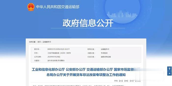 2020年7月24日,工業(yè)和信息化部辦公廳、公安部辦公廳、交通運(yùn)輸部辦公廳和國(guó)家市場(chǎng)監(jiān)督管理總局辦公廳聯(lián)合發(fā)布《關(guān)于開展貨車非法改裝專項(xiàng)整治工作的通知》,《通知》中明確決定自2020年7月至2021年5月組織開展貨車非法改裝專項(xiàng)整治工作,預(yù)防和遏制貨車非法改裝行為。尤其針對(duì)輕型貨車生產(chǎn)改裝企業(yè),四部門將聯(lián)手從2020年9月起至2021年3月,開展為期7個(gè)月的嚴(yán)格監(jiān)管,嚴(yán)厲打擊“大噸小標(biāo)”行為,目標(biāo)到2022年基本消除貨車非法改裝、“大噸小標(biāo)”等違法違規(guī)問(wèn)題。
