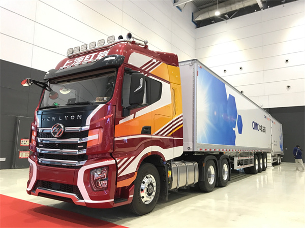 同時,現場還有中集運輸以上汽紅巖杰獅H6為拖頭的25.86米總長的綠色貨運列車。