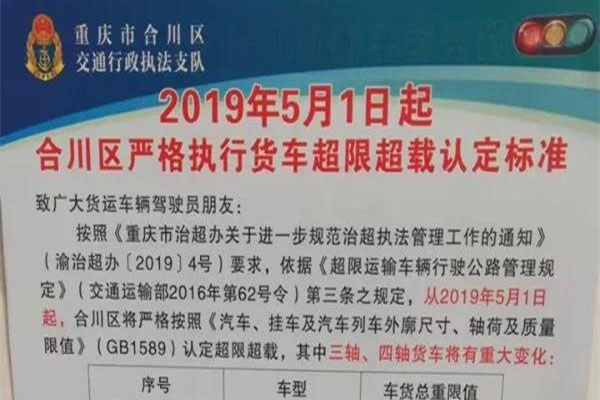 從2019年5月1日起,重慶市合川區開始實施貨車超限超載認定新標準,其中三軸四軸貨車將有重大變化。