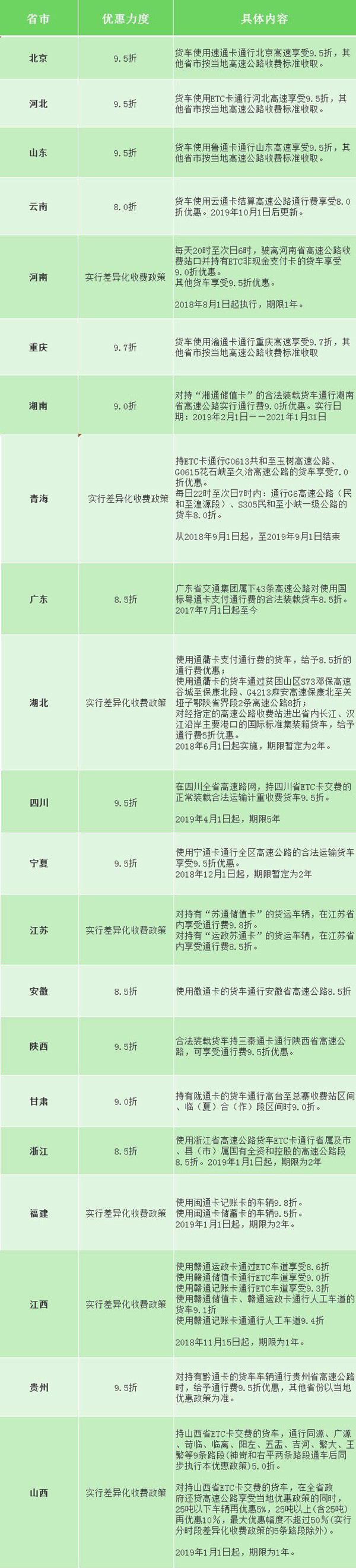 自2019年7月1日起,嚴格實施對ETC用戶不低于95折的通行優惠政策,并實現對通行本區域的車輛給予同樣的優惠力度,即外省ETC卡和本省ETC卡在本省高速公路享受同樣的優惠折扣政策。而不同的地區ETC優惠政策又有所不同,為方便可有出行,將各地ETC優惠政策進行匯總,僅供各位卡友作為參考。