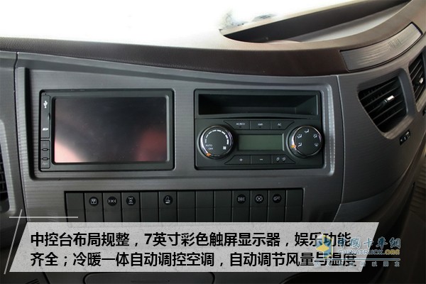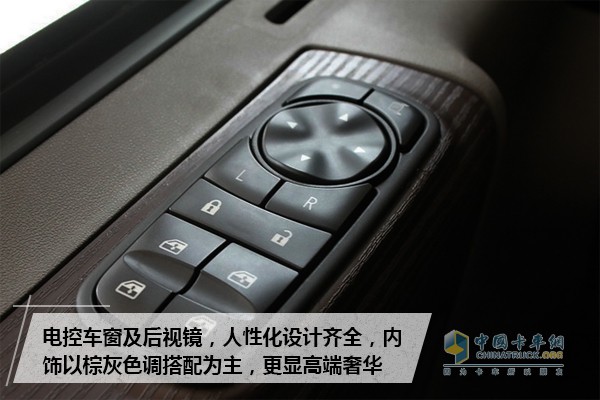 多功能方向盤設計,上方覆蓋巡航、電話及娛樂操作按鈕,方便司機便捷操作,降低疲勞強度。電動可調后視鏡設計,方便駕駛員找到最佳的后方視野,提高行車安全性。多功能觸摸屏配以低音炮音響,影音效果完美呈現,同時車輛擁有全自動恒溫空調、大容量冷藏箱。讓駕駛員可以輕松快樂的工作,不論身處何地都能居家般的愜意。