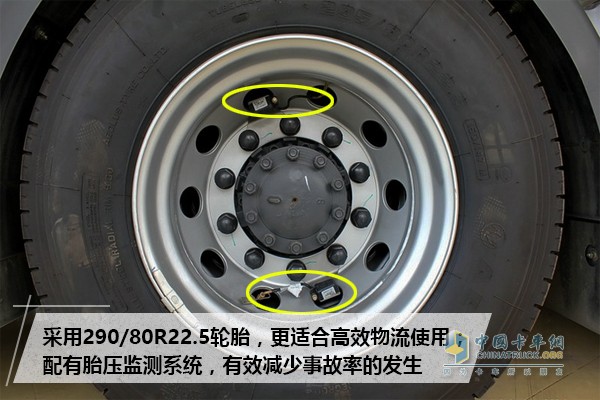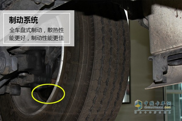 車輛帶盤式制動器、EBS系統,使得車輛在滿載情況下行駛速度為80km/h時制動距離相比傳統制動方式(鼓式制動器)平均縮短30%。胎壓監測系統可以實時監測輪胎氣壓,有效減少事故率的發生并節省油耗,延長輪胎使用壽命。